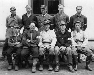 Vaktpersonell på Kongsvinger festning sommeren 1945. Fra venstre foran: Trygve Brandval, Einar Hynden, Odd Bratlie, Rolf Engen og Per Bratlie. Bak fra venstre: John Moe, Hans Børlie, Mentz Langbråten, Ivar Bråten og Ragnar Holt.